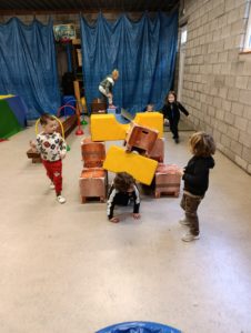 Dans la salle, chaque mercredi matin, les Petits Bouts participent à une séance de psychomotricité, dans un cadre ludique et basé sur un thème. Ces moments sont pensés pour leur permettre de :