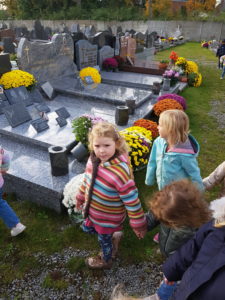 Début novembre, nous sommes allés à l’église, où l’Abbé Jean et Monsieur Mathy nous ont accueillis. L’Abbé Jean nous a même appris une petite chanson. Ensuite, nous avons parcouru le cimetière, paré de magnifiques fleurs à l’occasion de la Toussaint, en hommage à ceux qui nous ont quittés.